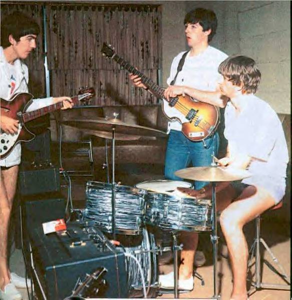 Left, The Beatles at the Wimbledon Palais, 14th Dec. 1963, with their standard set up: two AC30s and an AC30 head for Paul's T60 bass cab. These amps were evidently used at the Gaumont, Bradford, on 21st December too. See the pic on the Savage Young Beatles site.