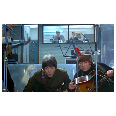Theatre scene from "A Hard Day's Night", filmed at the Scala Theatre, Charlotte Street, London, 23rd-30th March, 1964. George's cab in view on the stand, Paul's AC80/100 to its right, being moved.