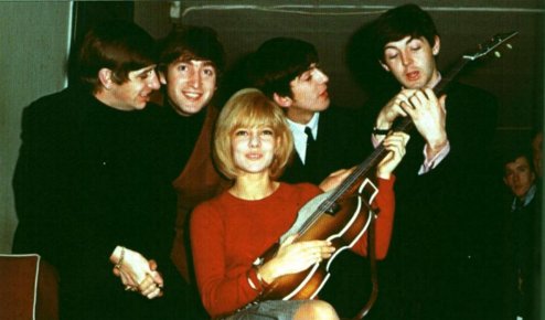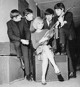 The Beatles at the Theatre with Sylvie Vartan. Note the red/maroon covers of the AC30 head and cab (the amp is too tall to be an AC50). These may have been spares. Sylvie Vartan's band had different amps on stage, as did Trini Lopez, who was also on the bill.