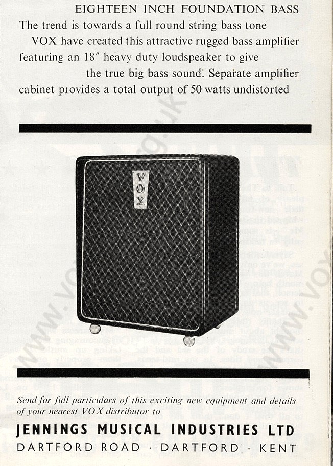 "Beat Instrumental" magazine, August 1963, signalling the arrival of Foundation Bass speaker cabinet along with the new amplifier. But it was some months before the AC50 made it to market. "50 watts undistorted" (from two EL34s) was somewhat hopeful, but good marketing twaddle nonetheless.