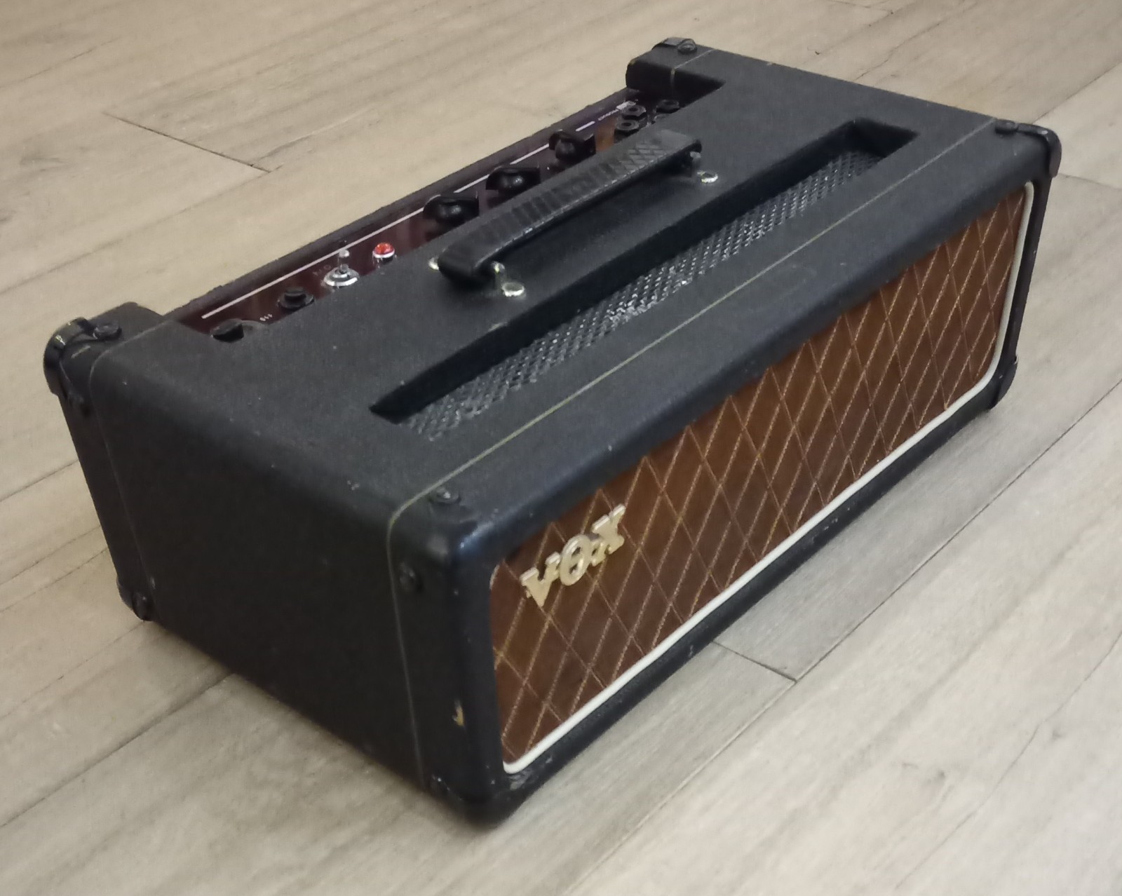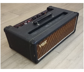 No pictures, but discussed on an old Vox Talks thread - click here for a copy. Copper panel, diamond inputs, grille cloth replaced, signs of a previous replacement handle, renewed corner protectors. Amp serviced by Eric Snowball of ESE Music, who replaced the Bulgin connector with a modern IE receptable. ES also serviced the amp near the top of this page.