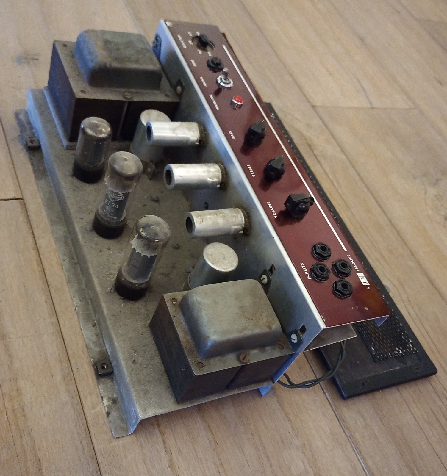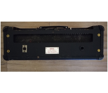 Used by the Brighton band "The Revivers". Replaced handle; on the back panel (just visible in the photo) two speaker outputs, and the original mains connector. The images were originally posted here. Thanks to Graham for permission to use on this site.