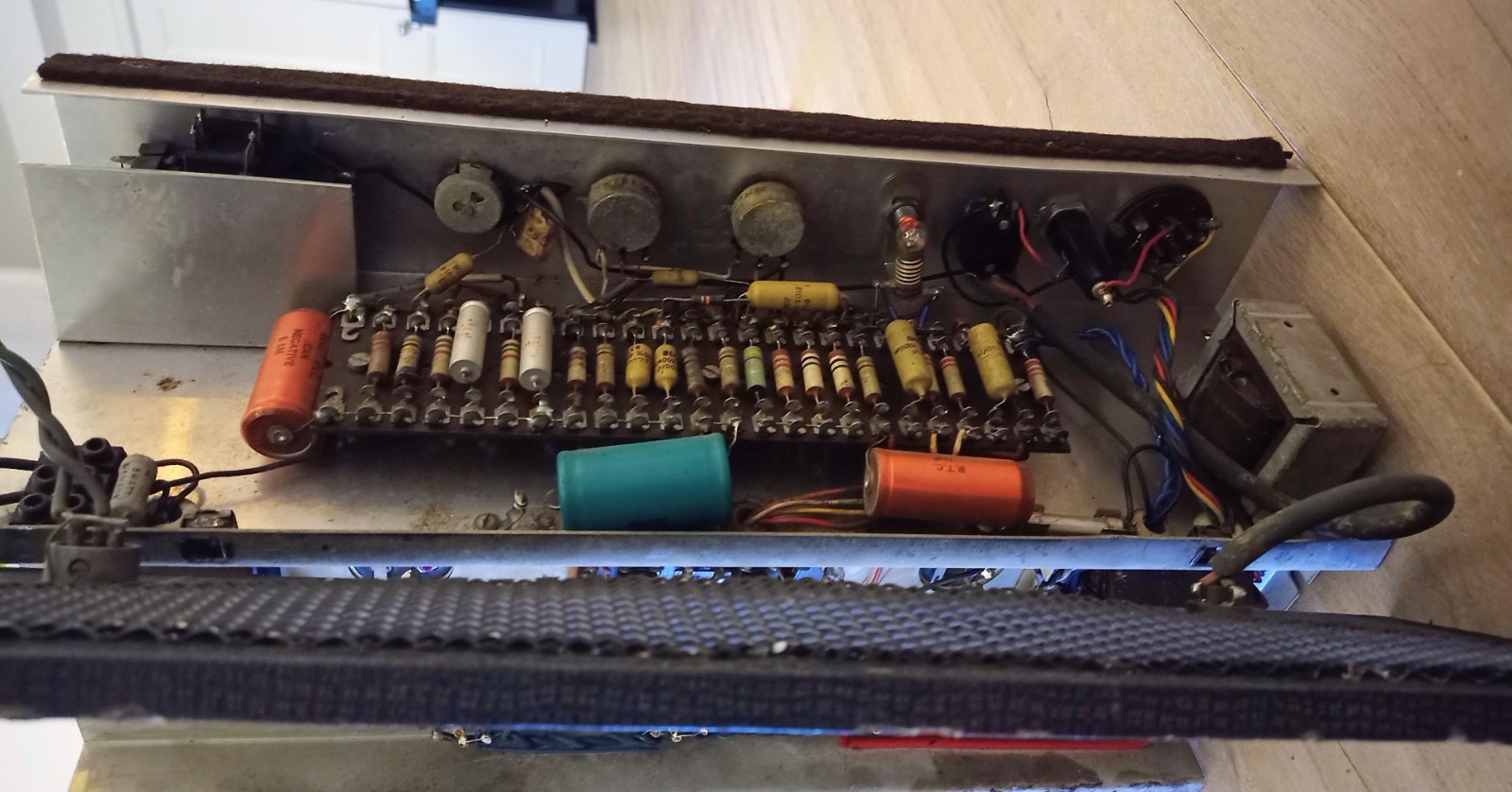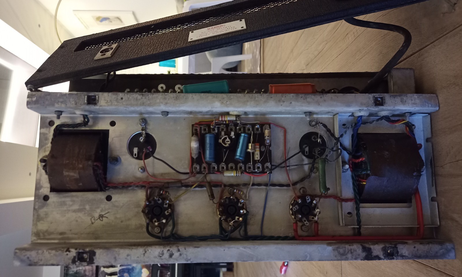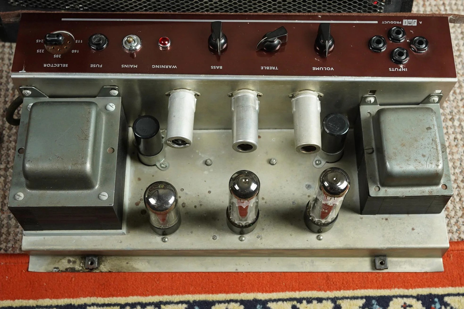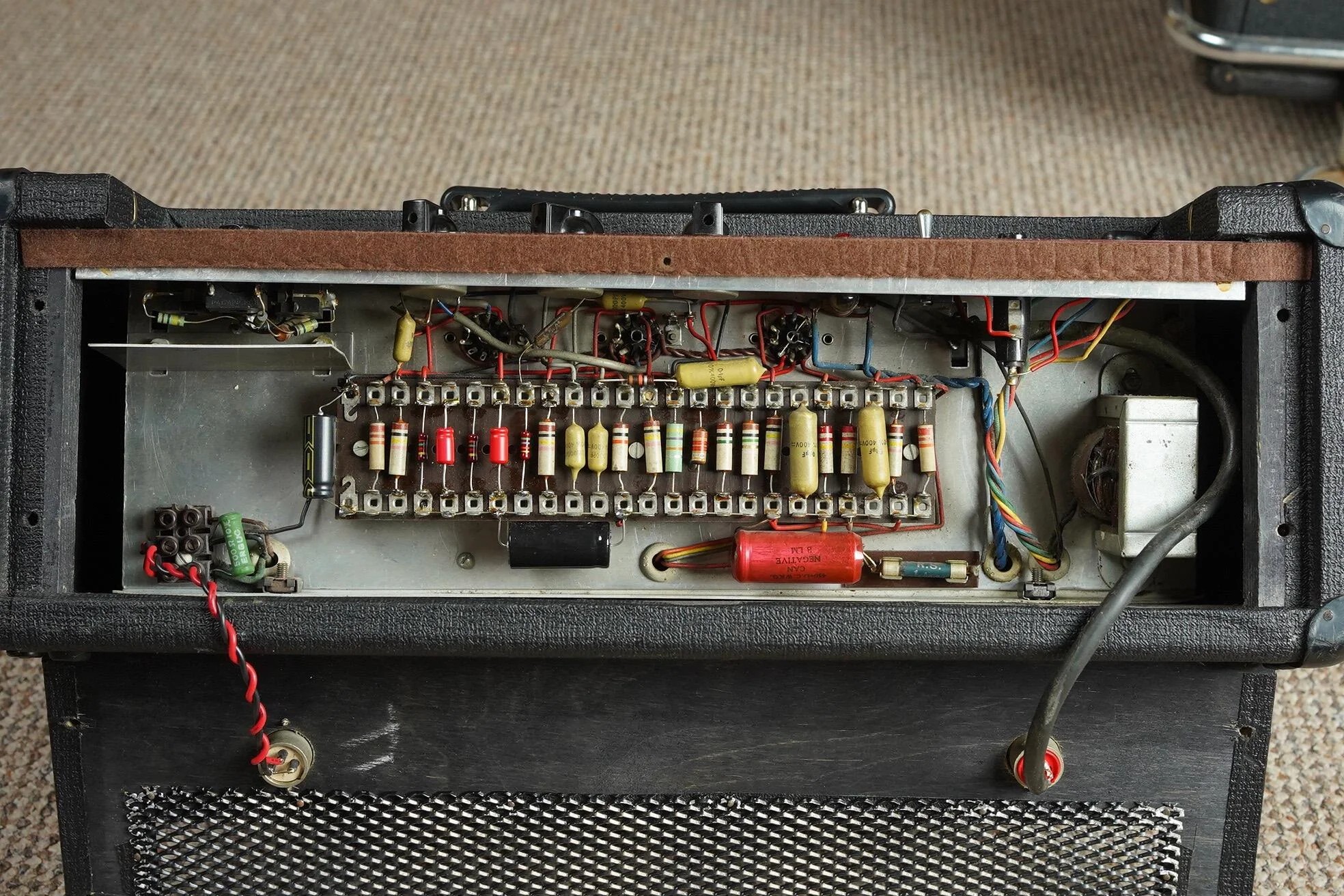 The black cloth, certainly in place in the 1970s, looks to be original. So too the electronics and chassis, which have more in common with two-input AC50s (early 1964) than the later four-input version. Yes, there are four inputs, evidently from factory, but there are early features in the chassis: long cut-outs for the cage nuts; pairs of screw holes (arranged diagonally) for the filter caps; a choke with no holes on top; and untwisted red 5v supply leads from the mains transformer to the rectifier valve.