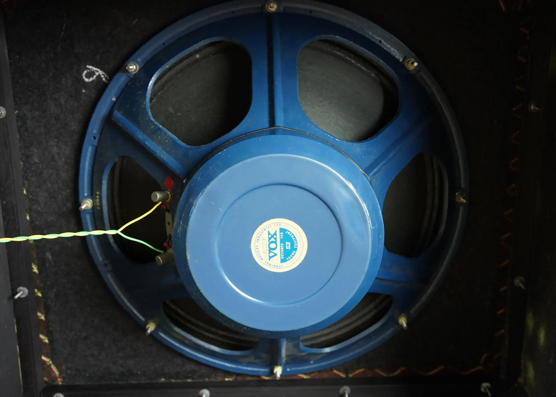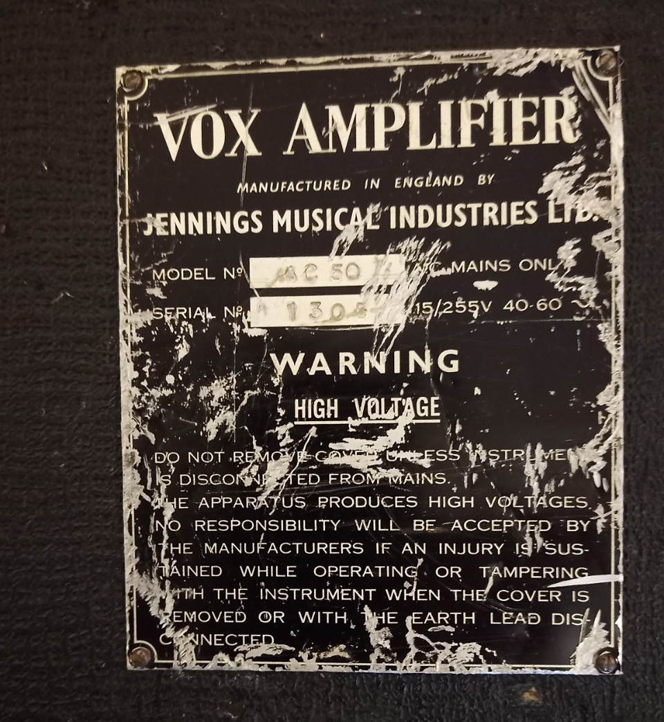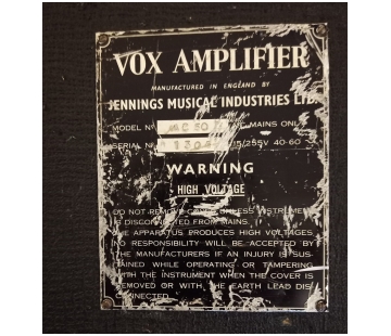 Sold on ebay in 2006. Originals mains socket and single speaker output in place. White warning plaque centred on back. Logo composed of separate letters: V O X. Note that there is no point of fixing on the upper edge of the back panel.