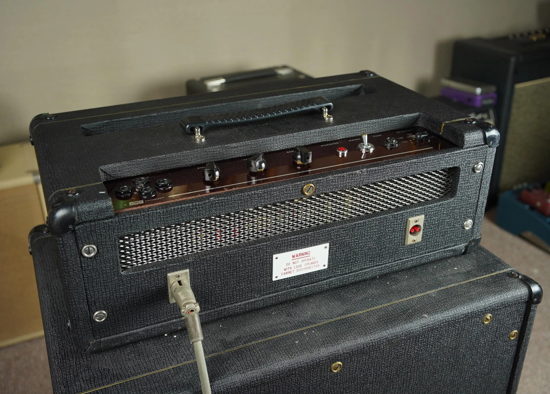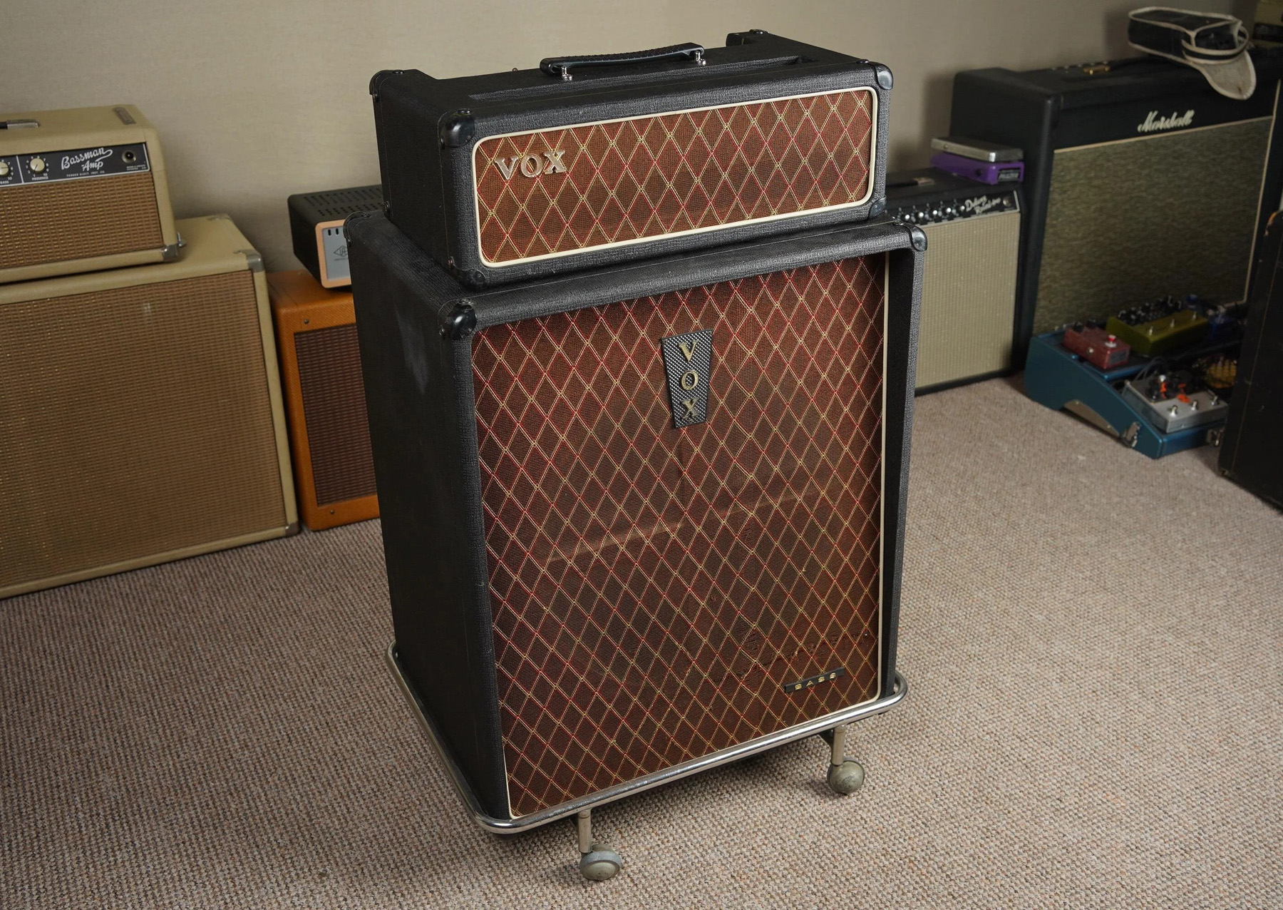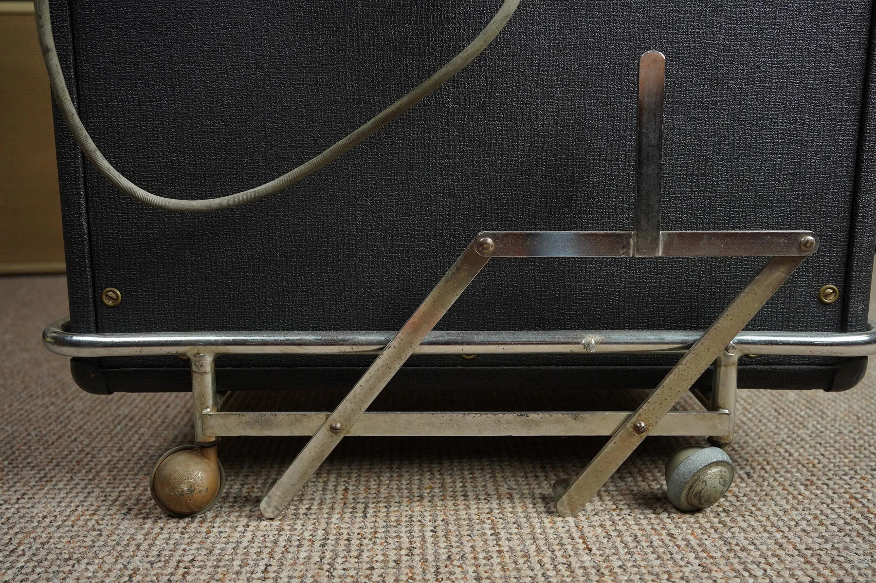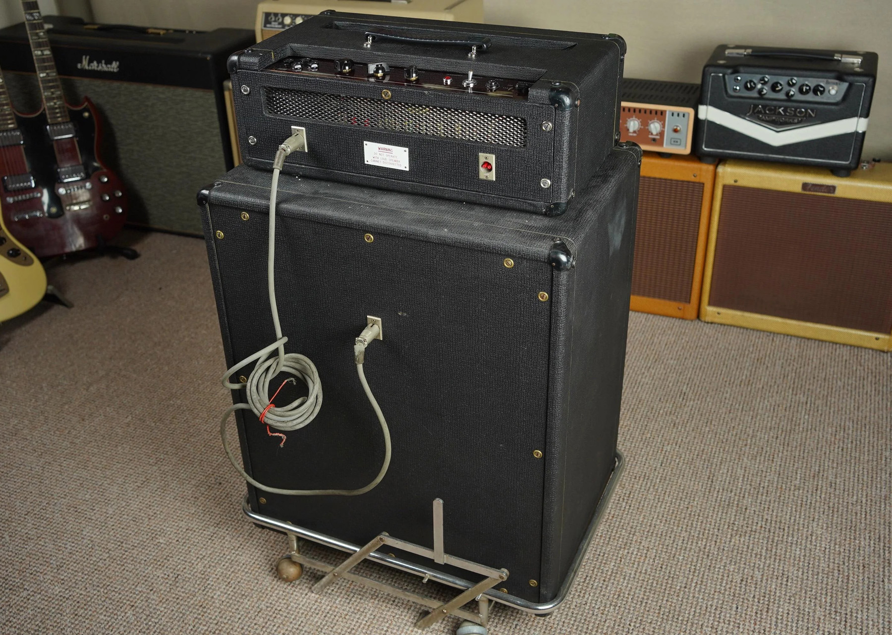 A nice amp paired with a repro cab and stand. Unrelated to the amp above - note the wear on the top leading edge.