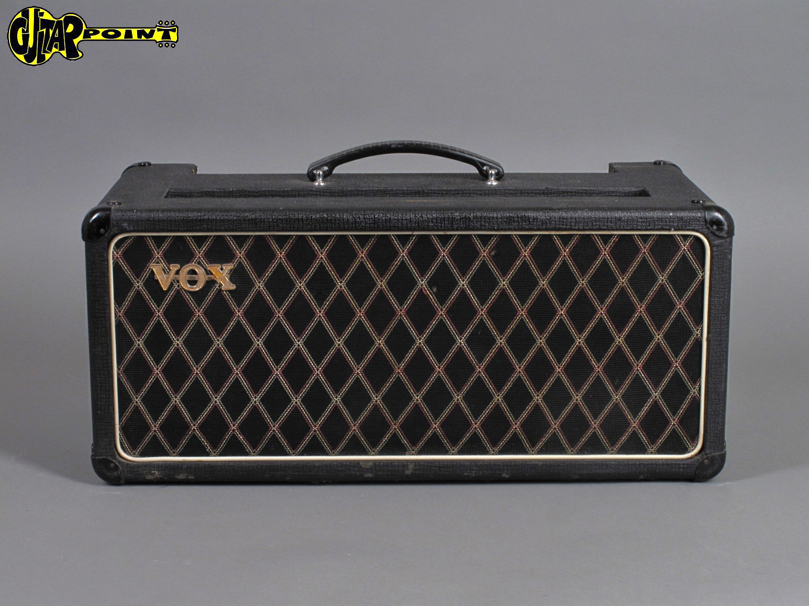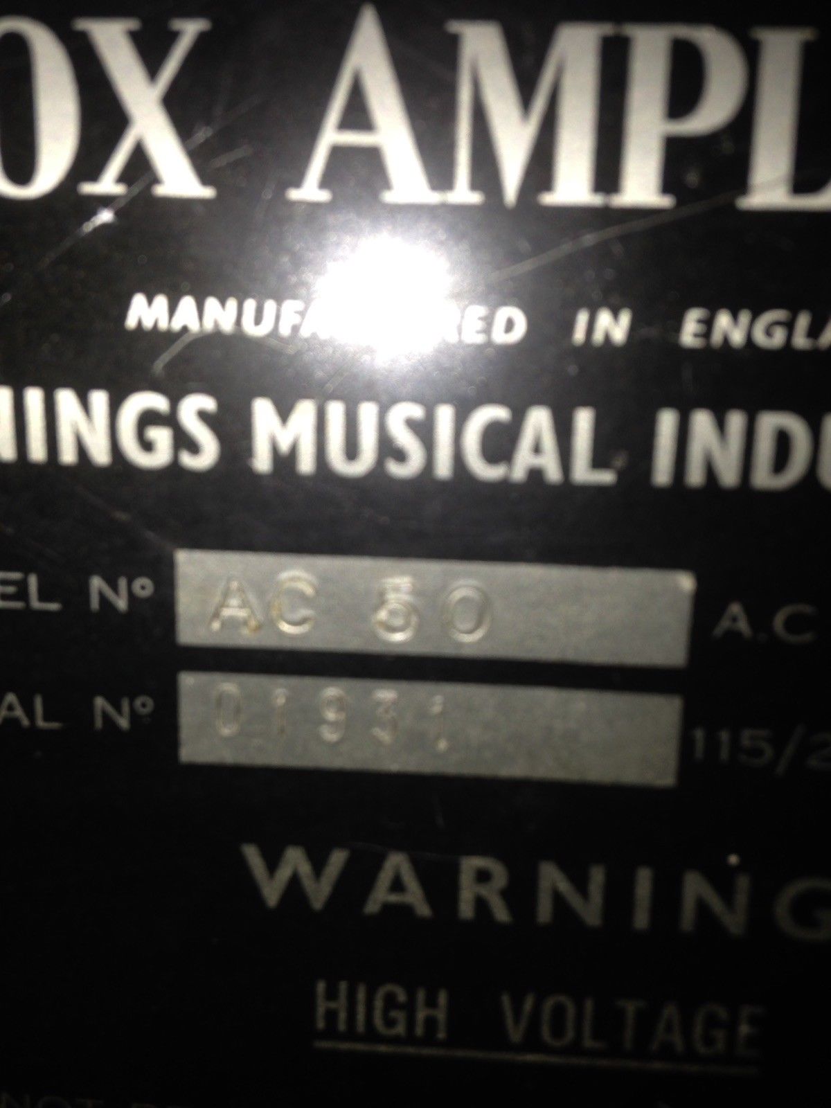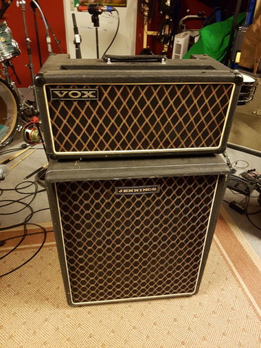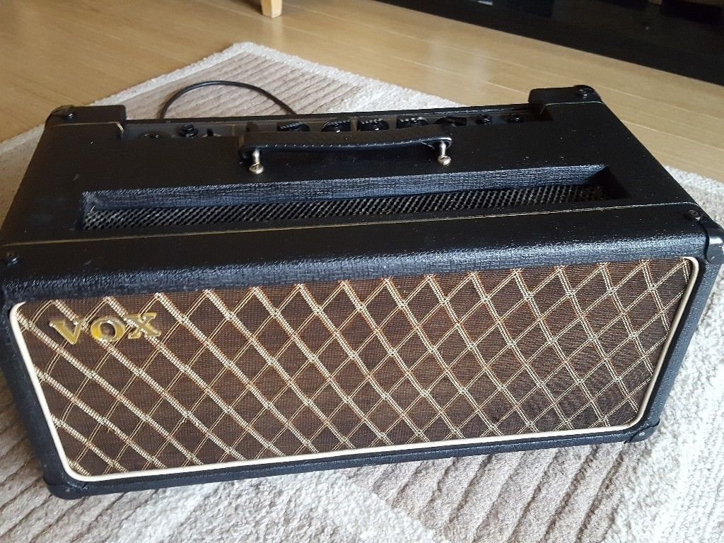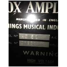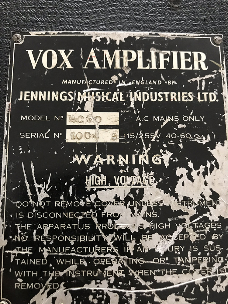 From the small ads of Melody Maker magazine, 13th March 1965: "1964 (July) Vox AC 50 Amp. Bass Amplifier, £90". Given the date of purchase, evidently a small box AC50 Mark 1, either thin or thick edged.
