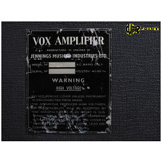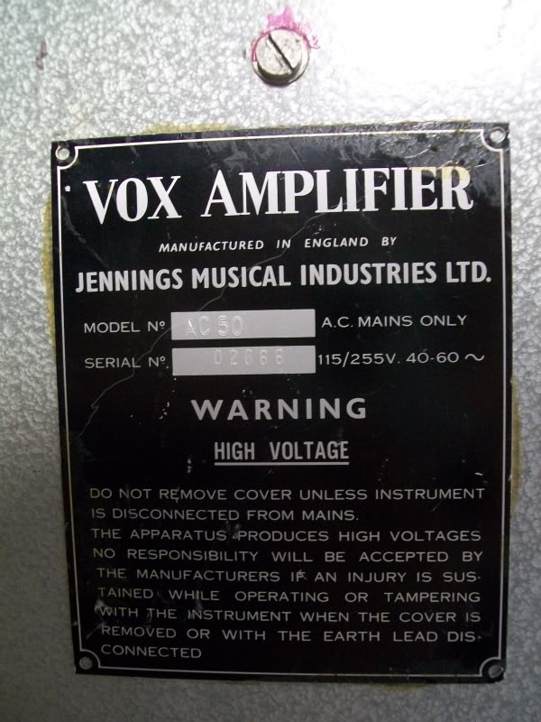 "Vox Sound Equipment Limited" AC50 serial no. 1081, the highest number to have surfaced so far. The cab is a Jennings Electronic Industries B1 (bass, 1 x 18"), from 1969-1972. Further pictures here. Thanks to Roland.