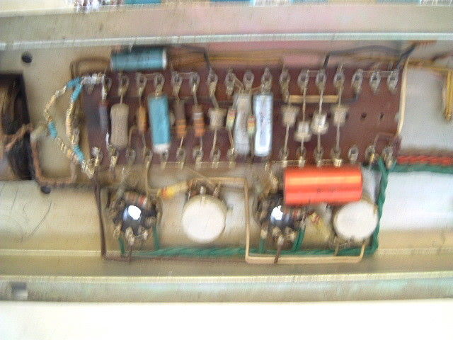The two images above, the output transformer from serial number 5369 its the plain metal shroud lacking. The black-shrouded units were introduced shortly after this amp had been produced.