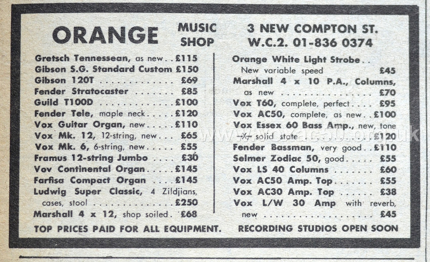 "Melody Maker" magazine, 5th October 1968 - the new Orange shop on New Compton Street. Part of the premises had formerly been owned by JMI. Two AC50s in stock. The Vox Essex bass amp must have been an import from the USA.