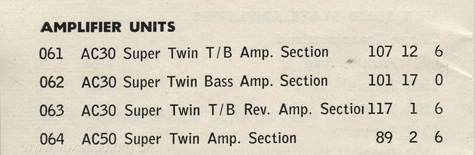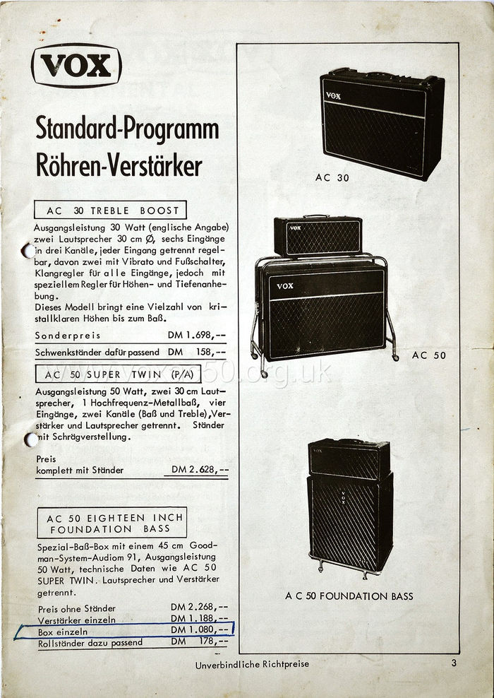 A page from a German brochure, printed in September 1967 and circulated in 1968. 2628 deutsche marks (for the AC50 super twin) was equivalent to around £260 - £4300 or so in today's money (according to the Bank of England inflation calculator). The amp alone was 1188 deutsche marks = £110 in 1967 = £1800 today.