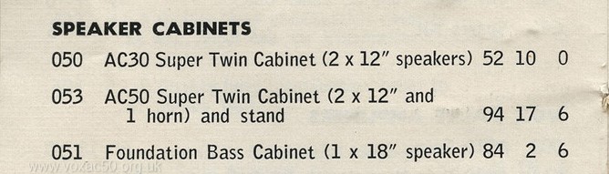 Melody Maker magazine, 30th January 1965: a Vox A.C.50 Super Twin and Stand" for £184. This was the standard retail price at the time.