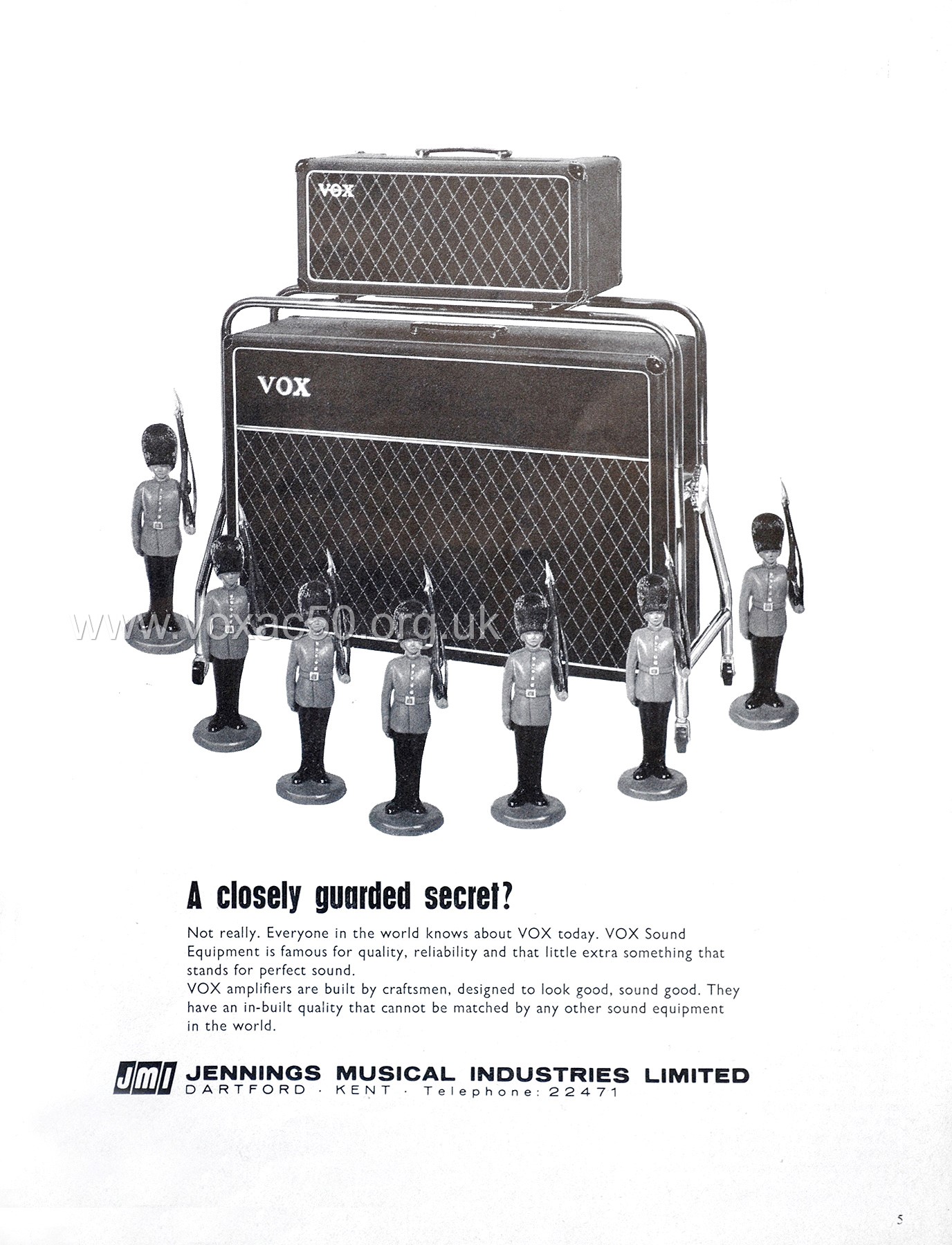 Continuing the theme of adverts, above, one first published in "Beat Instrumental" magazine, May 1966 - perhaps a sort of passing reference to the AC50's name in the U.S.A. in 1965: the "Royal Guardsman". By May 1966, however, sales of English valve amps had more or less come to an end.