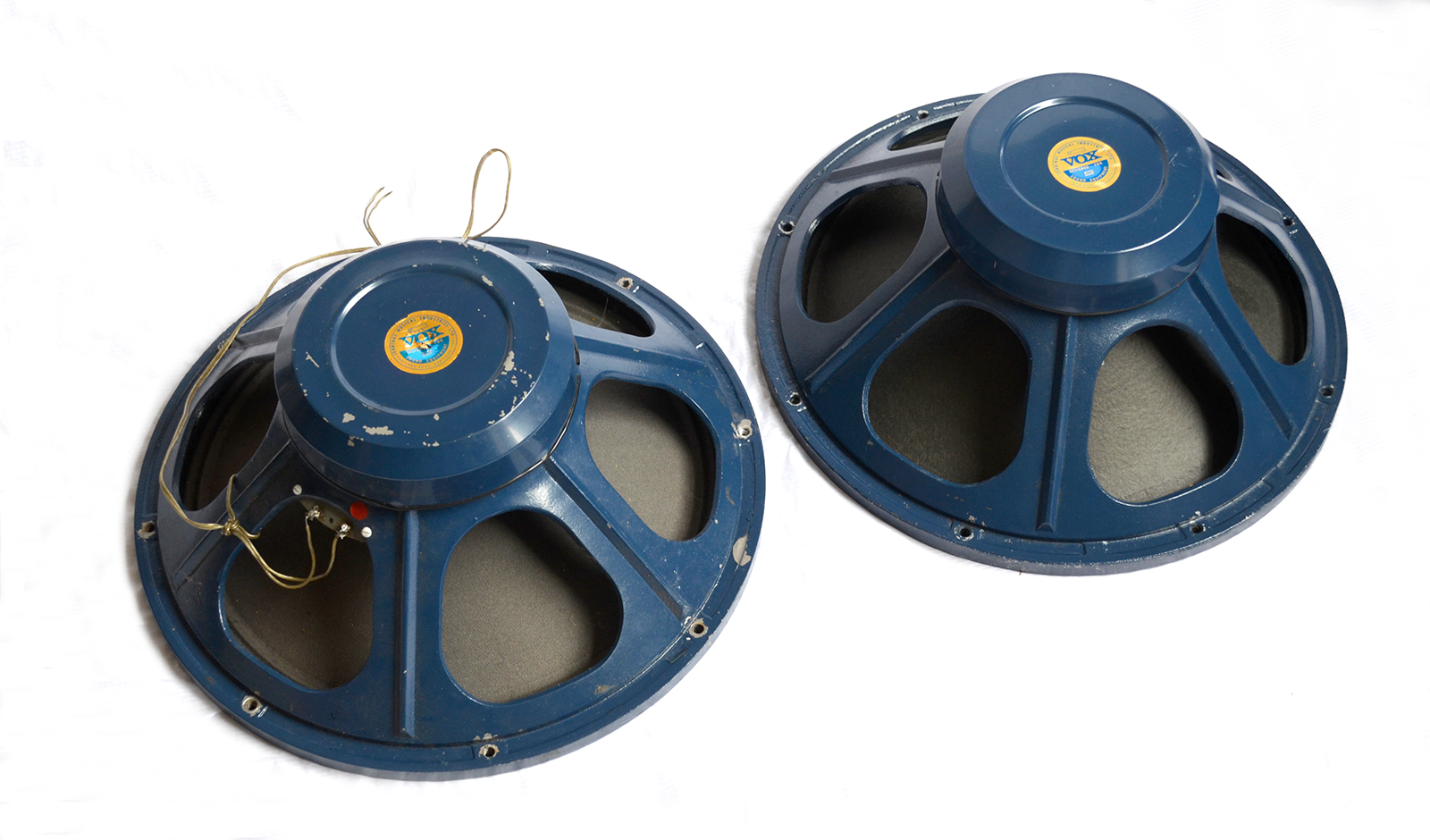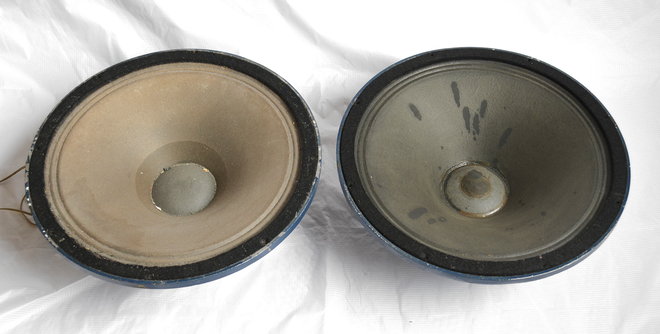 Below, a couple of 18" Celestion speakers in Jennings blue from early Foundation Bass cabs (before mid 1964). One is a T1022, the other a T1079. Both are 8ohm. The speaker on the left has been reconed.