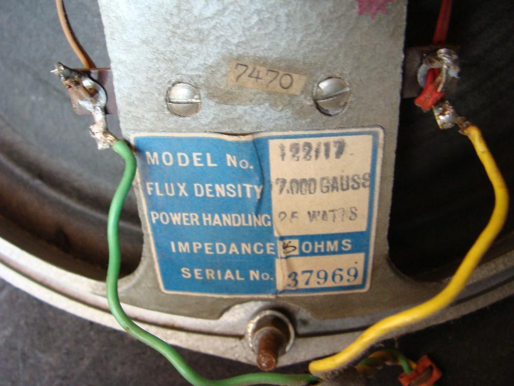 Model no. 122/17, 25 watts power handling, 15ohms. Serial numbers can be a good guide to the relative dates of cabinets. Note the Fane part no. 7470.
