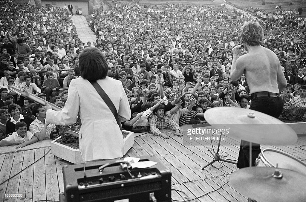 Two shots of Johnny Hallyday and band from Getty Images, the first from 1967, the second 1966. Great views of the brown-fronted diamond-input amp and Foundation Bass cab.