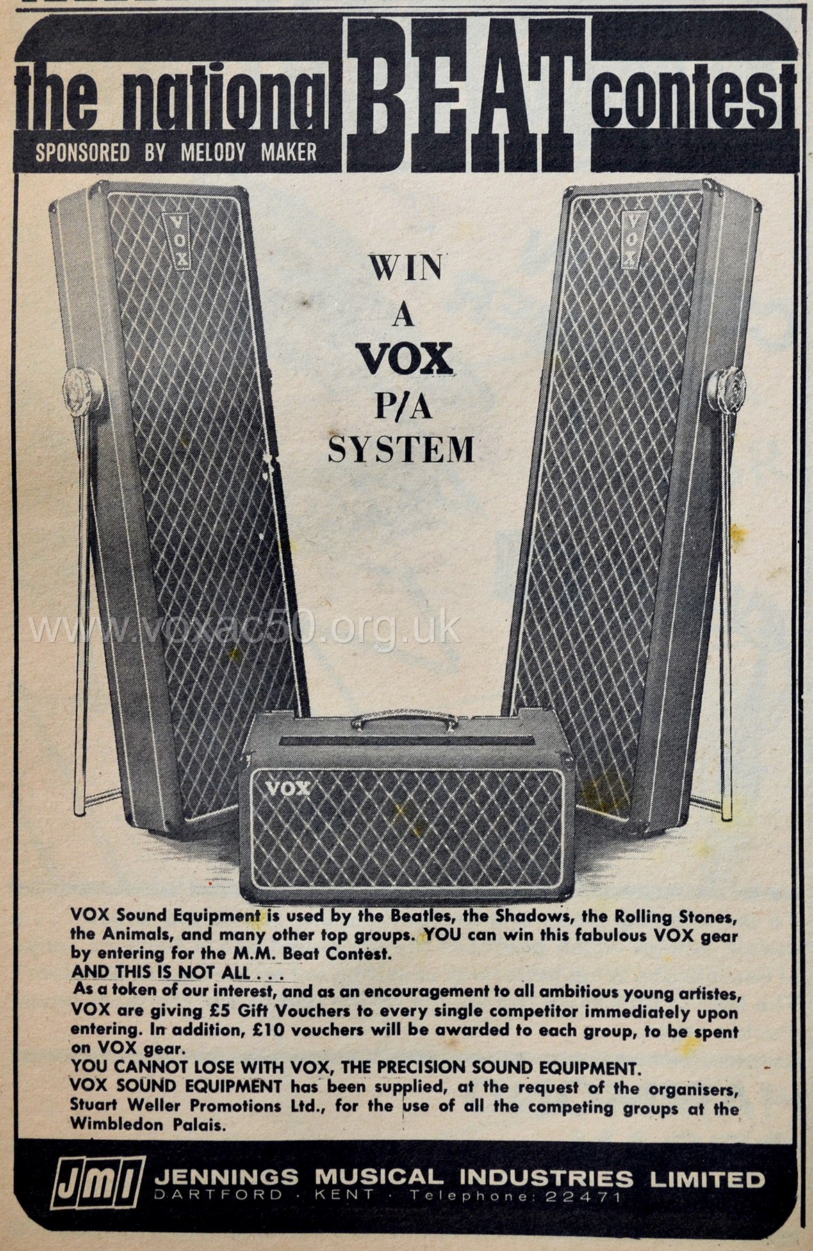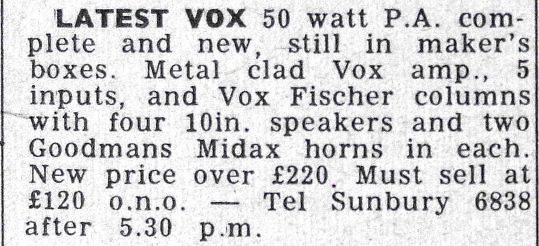 Judging by the ads in the back of Melody Maker magazine, Vox AC50s paired with Line Source speaker columns seem to have caught on as PA amps. There is also this short notice: