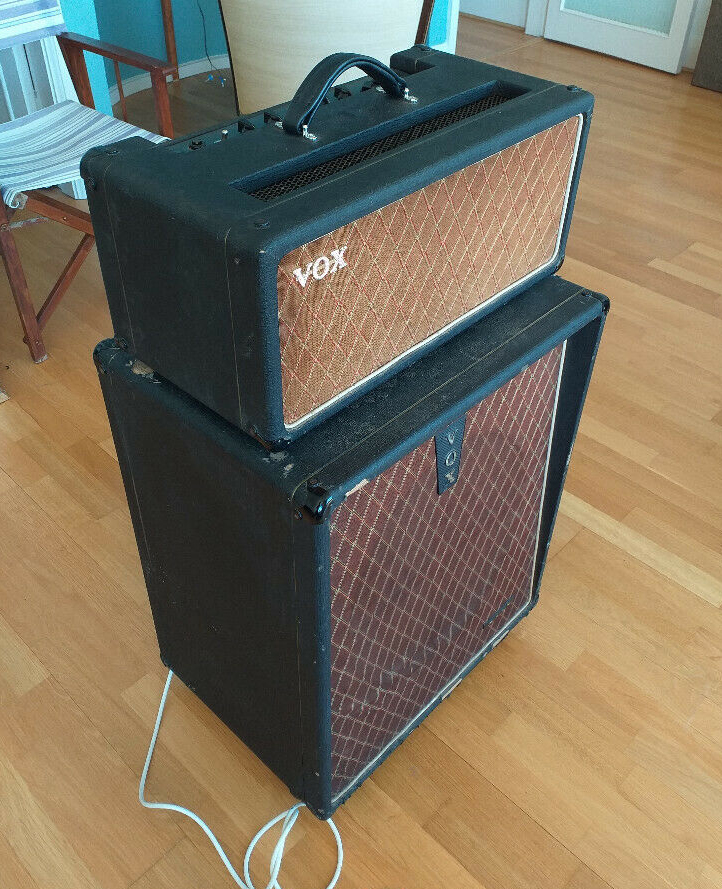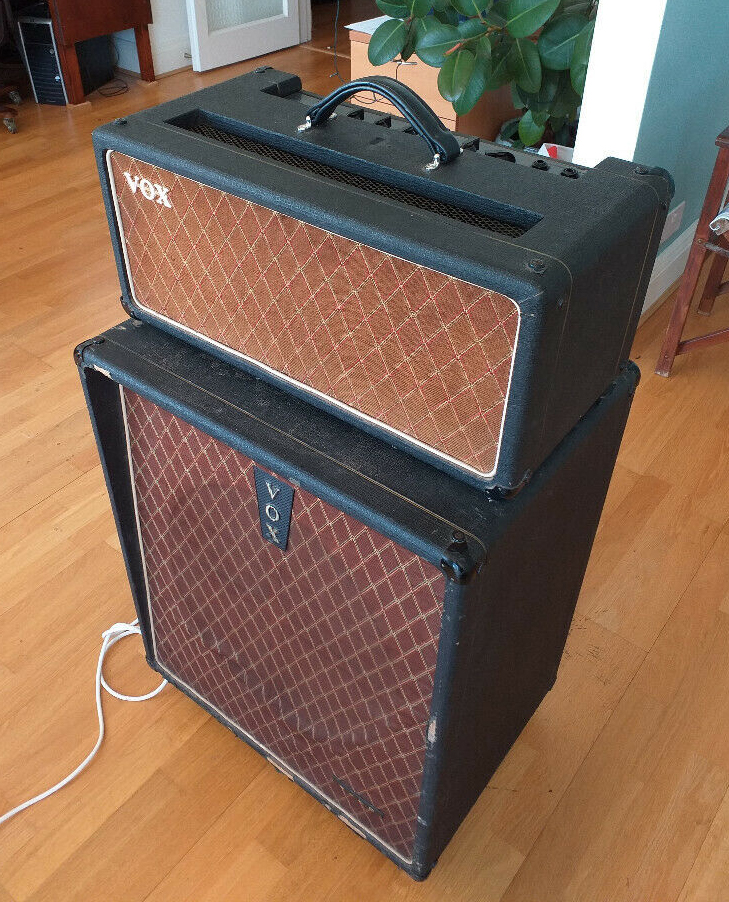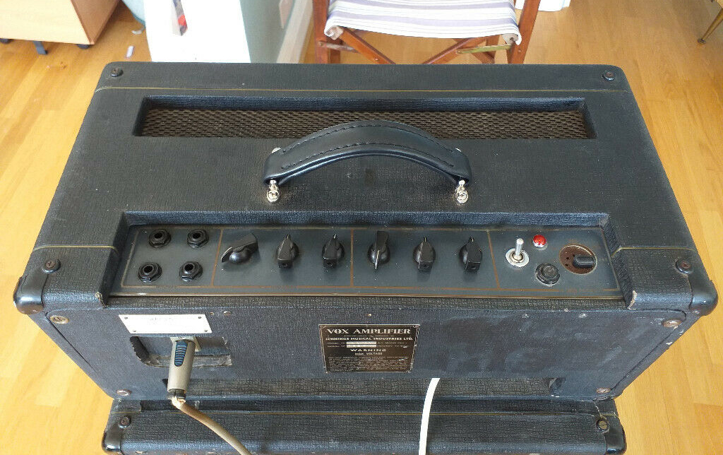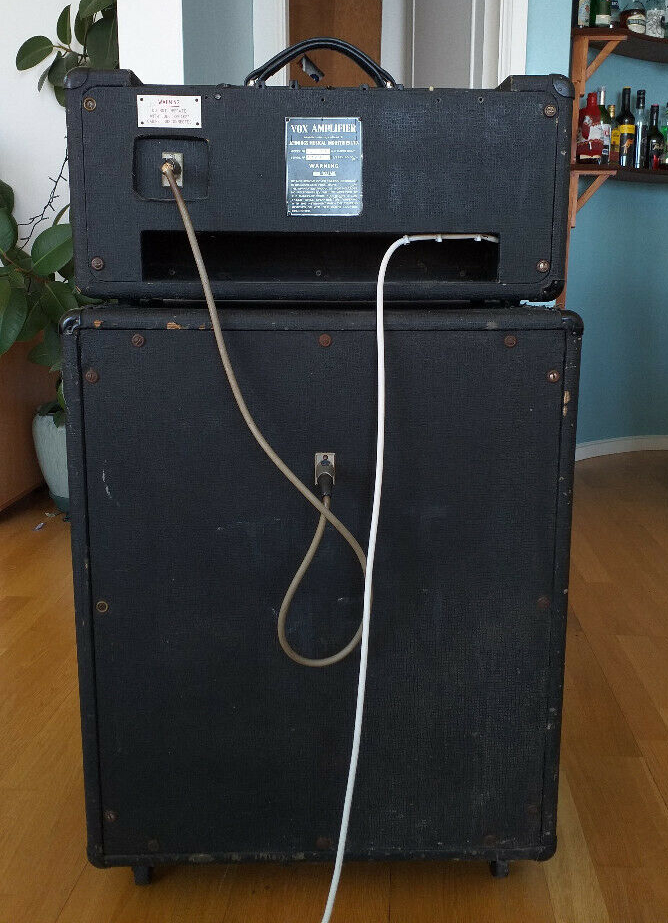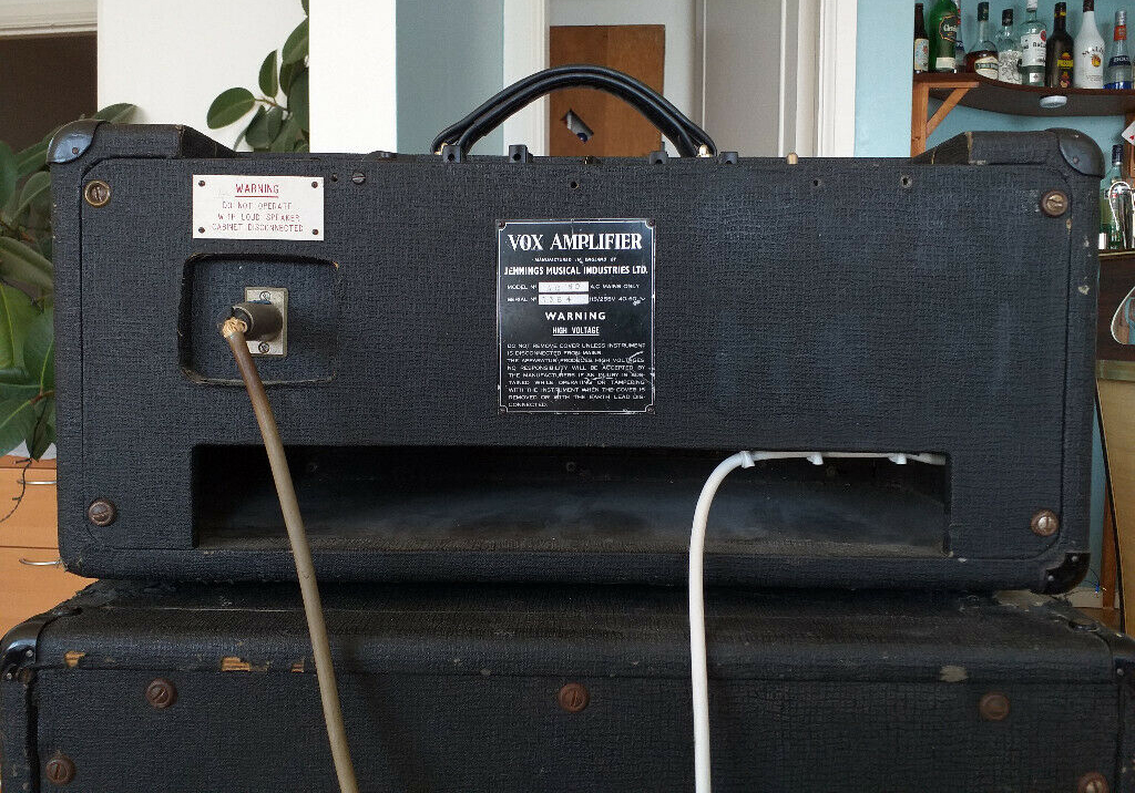 Some pictures of serial number 1384 (an early AC50 mark 2, valve rectified, large box) with its original Foundation Bass speaker cabinet and speaker cable with Amphenol connectors.
