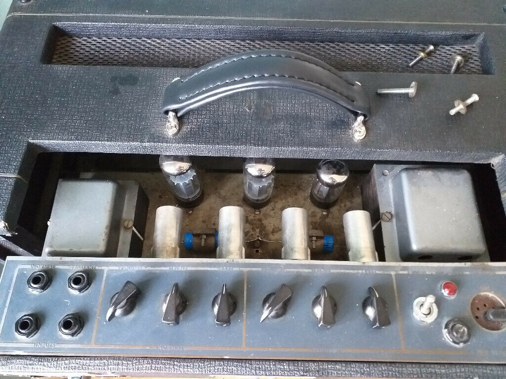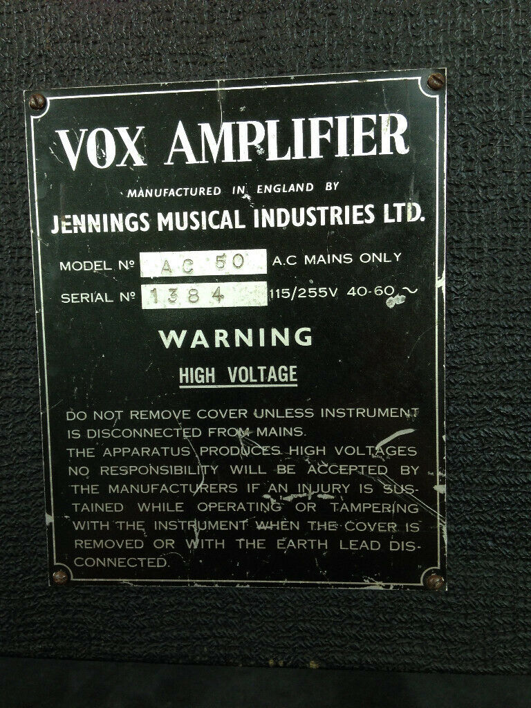 On the amplifier the original link voltage selector (typical of the earliest AC50 mark 2s), and one of the original Cannon XLRs. There is no engraved speaker escutcheon plate on the back panel - simply a section of tolexed ply, evidently in place for some time.